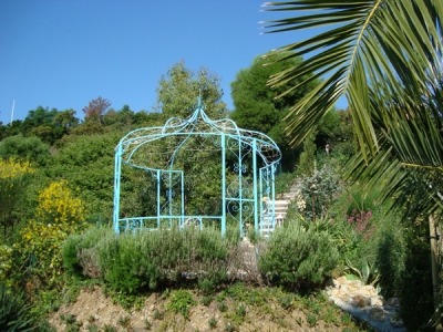 Am Ende des Gartens auf einer kleinen Anhöhe: Der Pavillon mit Rund-um-Blick